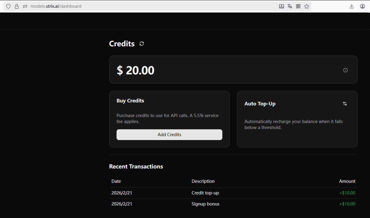 (不要购买,原因是我们应该自行使用自己的KEY,而不是通过strix 调用chatgpt5. 大陆香港不行的)然后,根据提示,进行购买:https://models.strix.ai/dashboard